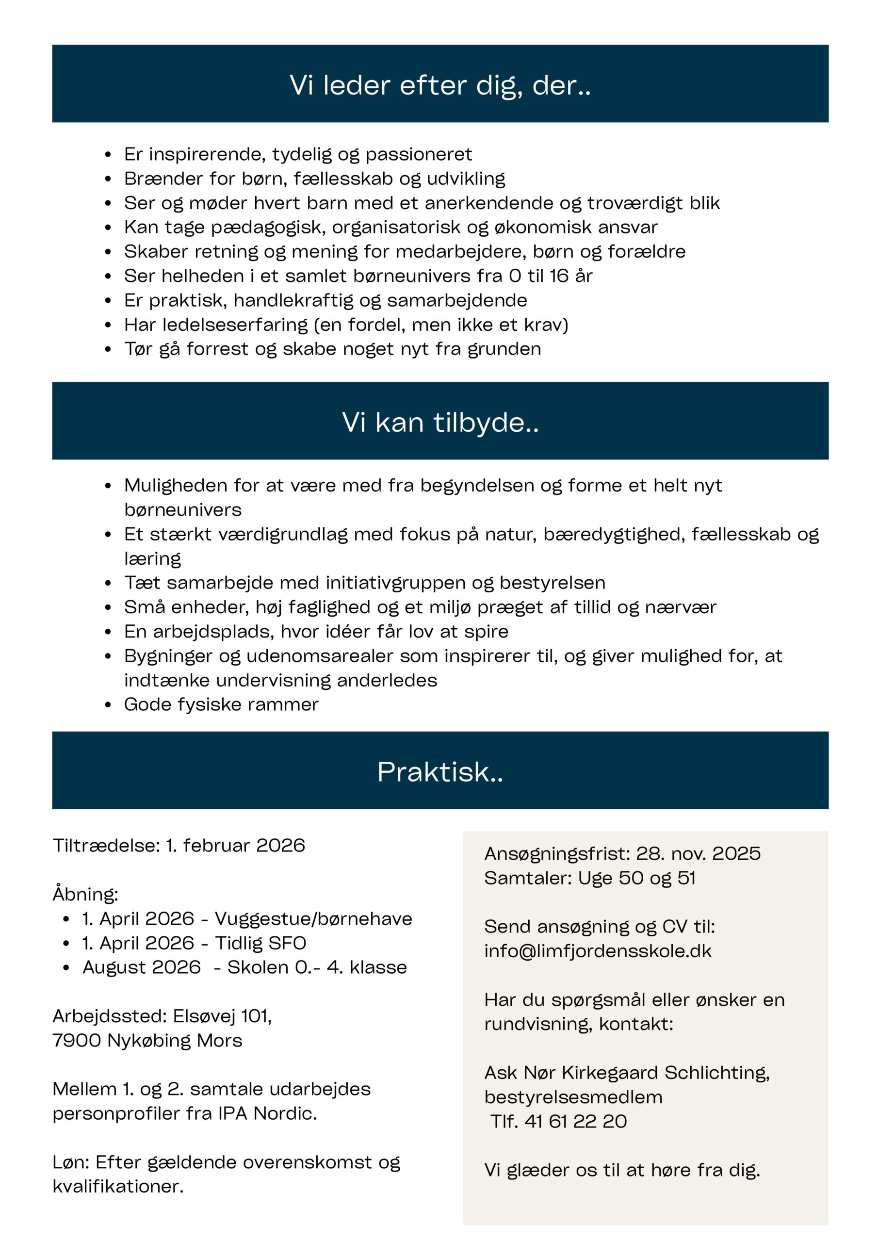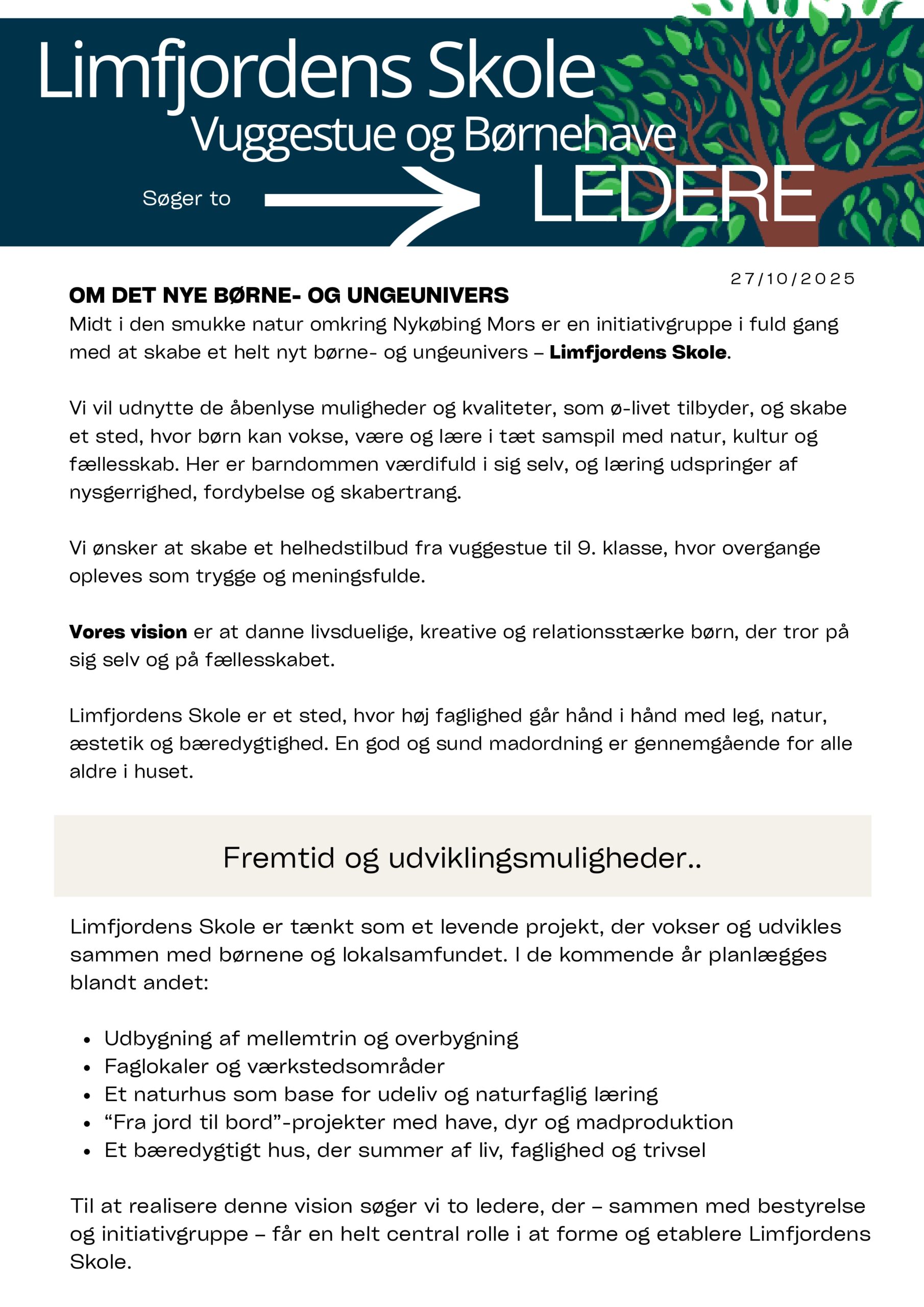 Pressen bedes kontakte initiativgruppens medieansvarlige Ask Nør Kirkegaard Schlingting på info@limfjordensskole.dk eller på telefon 41 61 22 20